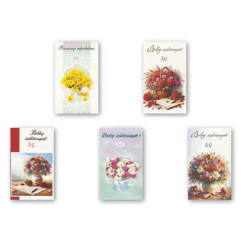 Gratulačná karta s maďarským textom a nastaviteľnými rokmi.Súčasťou je obálka.