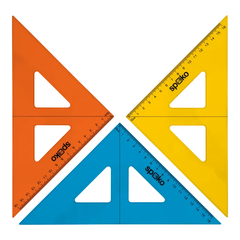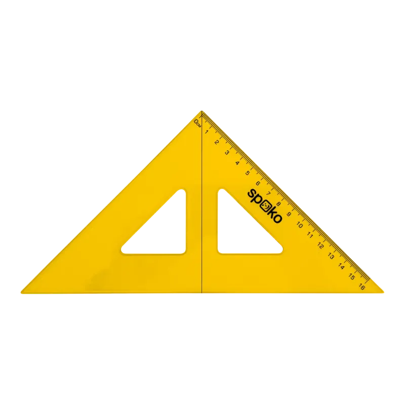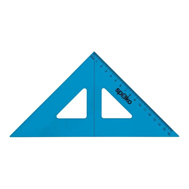 Rovnoramenný pravouhlý trojuholník s ryskou a predtlačenou stupnicous dĺžkou 16 cm. Pravítko zviera uhly 45°/90°/45°. Balenies eurozávesom.