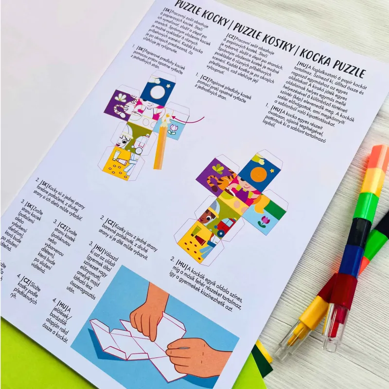 Pripravte sa na tvorivú zábavu so 6 papierovými kockami, ktoré sú takmer hotové! Jednoducho ich vylúpnite (nie sú potrebné žiadne nožnice!), poskladajte a zlepte. Na kockách nájdete nevyfarbené časti, ktoré sú ideálne na personalizáciu pastelkami alebo fixkami. Predlohy puzzle obrázkov sú vytlačené na opačnej strane každej kocky.