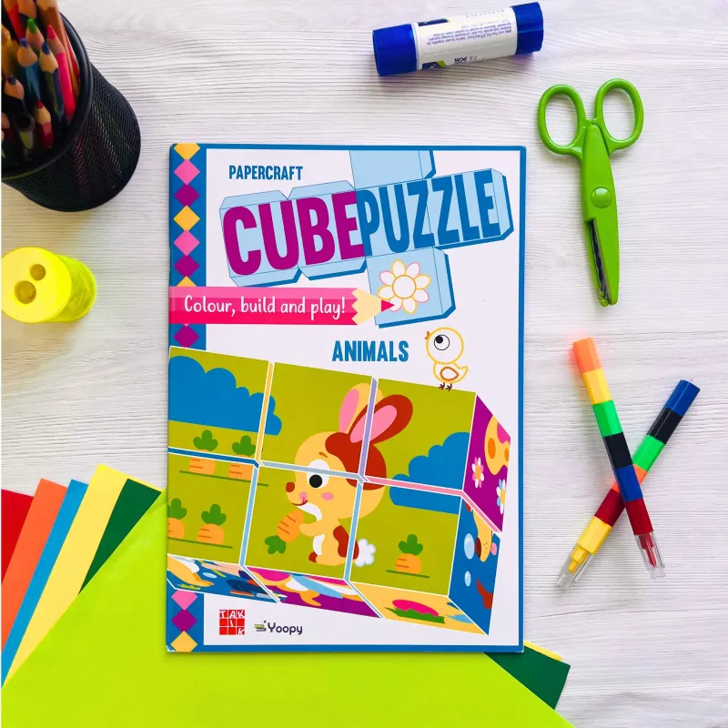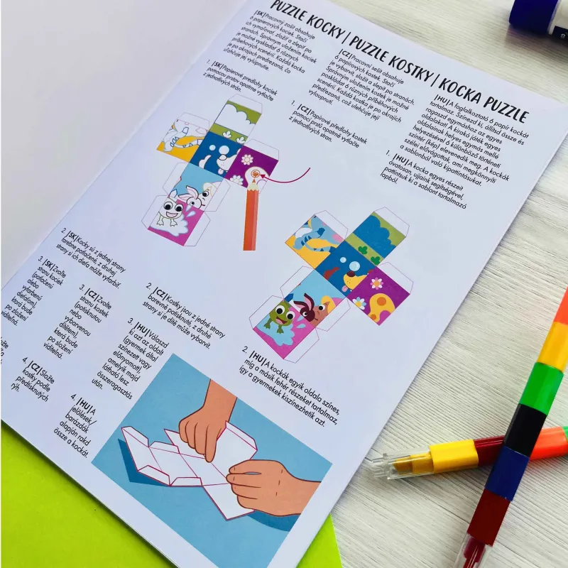Pripravte sa na tvorivú zábavu so 6 papierovými kockami, ktoré sú takmer hotové! Jednoducho ich vylúpnite (nie sú potrebné žiadne nožnice!), poskladajte a zlepte. Na kockách nájdete nevyfarbené časti, ktoré sú ideálne na personalizáciu pastelkami alebo fixkami. Predlohy puzzle obrázkov sú vytlačené na opačnej strane každej kocky.