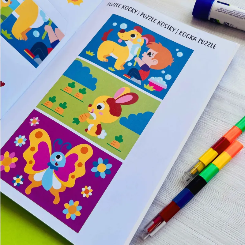 Jedna strana každej kocky je vopred potlačená žiarivými farbami, zatiaľ čo druhá vyzýva vaše dieťa, aby ju vyfarbilo pomocou vlastnej fantázie. Súčasťou sady je textový aj vizuálny návod. Táto pútavá hračka ponúka nekonečnú znovu hrateľnosť a pomáha podporovať jemnú motoriku a logické myslenie vášho dieťaťa.