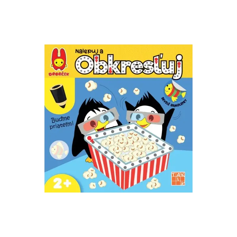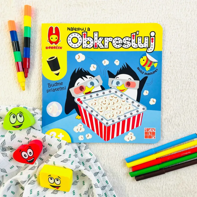 Kniha Nalepuj a obkresľuj – Buďme priateľmi prepája dvojicuobľúbených detských aktivít – nalepovanie a obkresľovanie. Detiprostredníctvom samolepiek a spájania bodiek spoznajú veselých zvieracíchkamarátov. Zároveň si rozhýbu pršteky, naučia sa nové tvary a precvičiasi pozornosť, jemnú motoriku aj sústredenie.