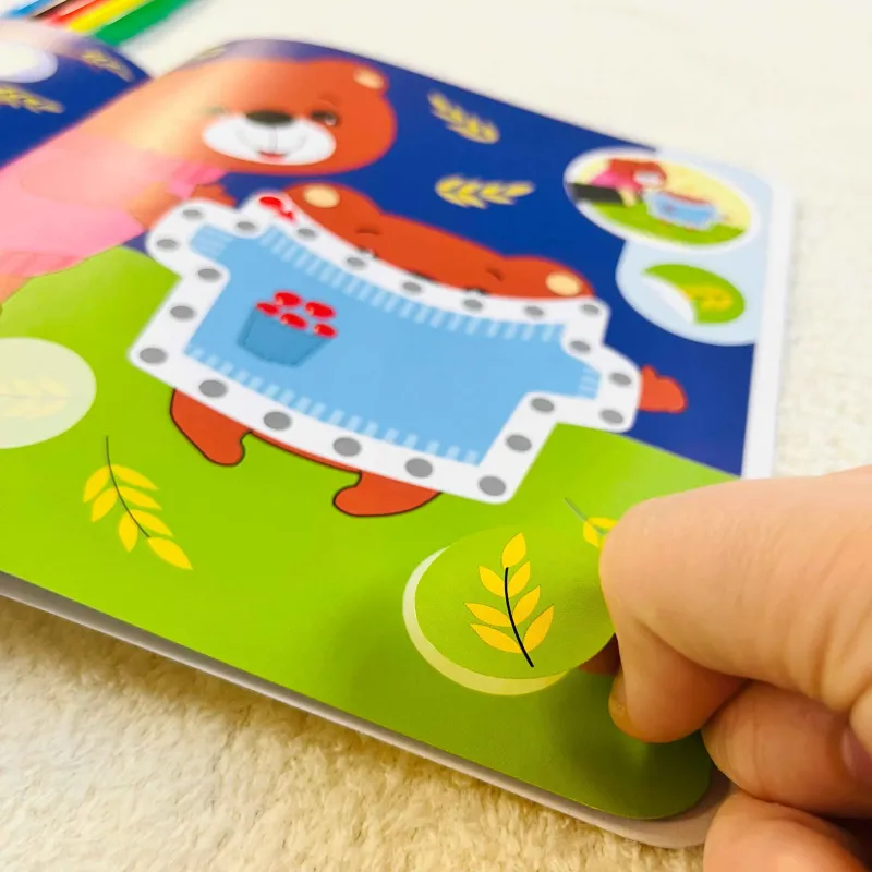 Každá strana obsahuje pestrofarebný obrázok a dve úlohy – nalepovanienálepiek a obkresľovanie. V hornom rohu sa nachádza pomôcka, ktorádieťaťu napovedá, ako by mal vyzerať obrázok po správnom vyriešeníoboch úloh.