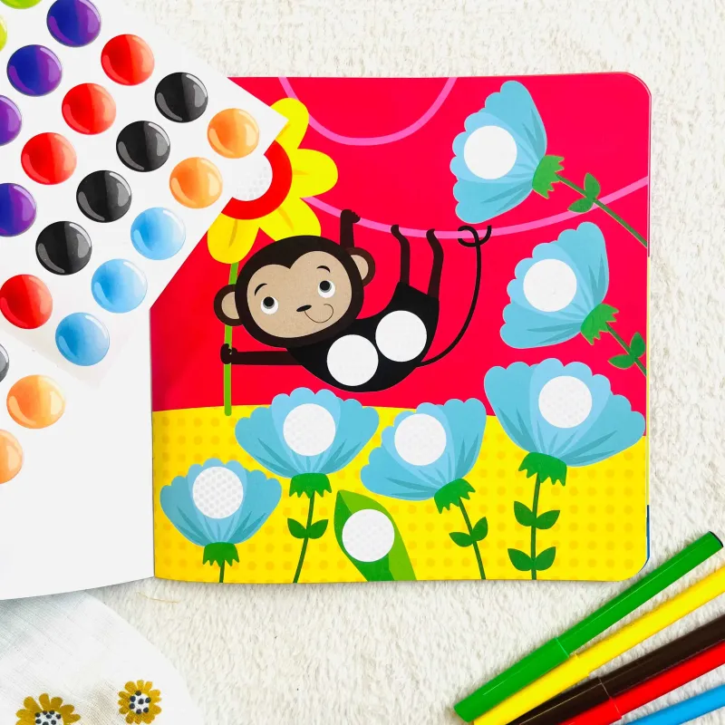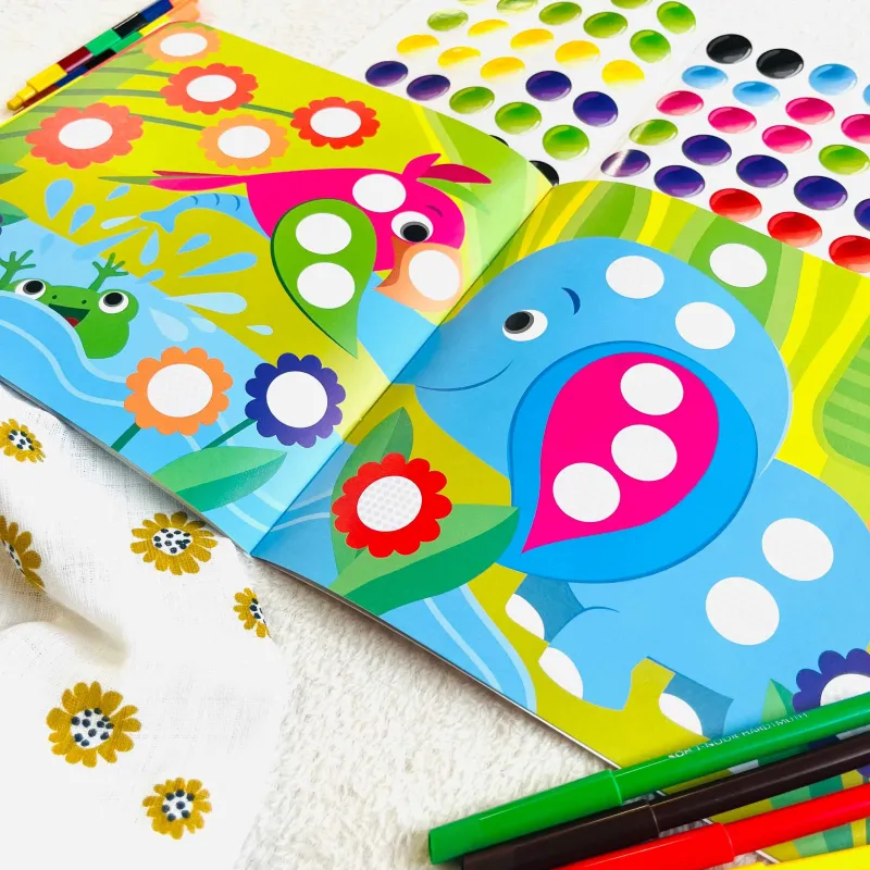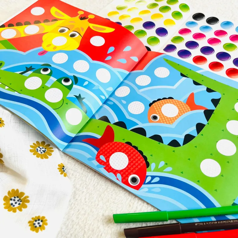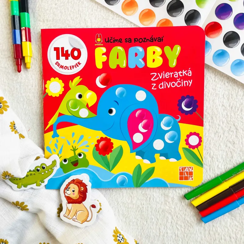 Úžasná zábava s farebnými nalepovacími bodkami. Na každej strane sanachádza neúplný obrázok s niekoľkými chýbajúcimi miestami. Úlohoudieťaťa je prilepiť na ne okrúhlu samolepku správnej farby. Tak dotvoríobrázok a zároveň si cibrí svoju jemnú motoriku, pozornosť, sústredenosťaj logické myslenie.