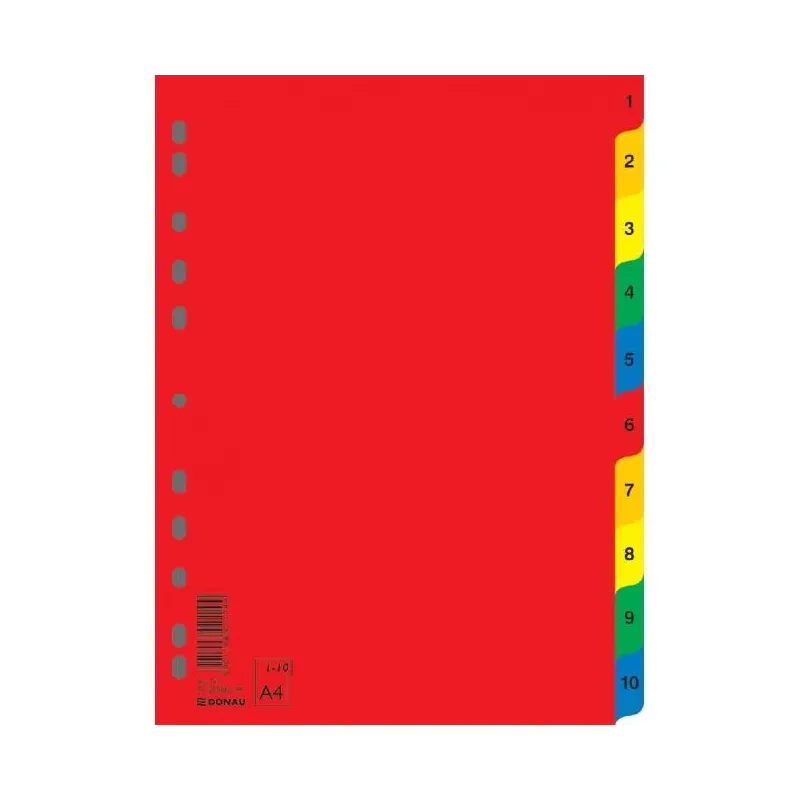 Rozraďovač formátu A4 vyrobený z tuhého polypropylénu. Jednotlivé stránky v rôznych farbách, multiperforácia na použitie rozraďovača v krúžkovom aj pákovom zakladači.