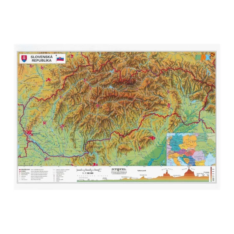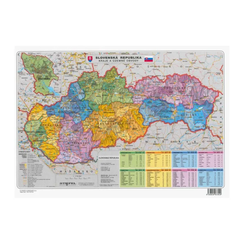 Dve mapy v jednej: Z jednej strany nájdete všeobecnogeografickú mapu s reliéfom pohorí, nížin a vodstiev. Druhá strana ponúka administratívne členenie, prehľadne zobrazujúce kraje, okresy a územné obvody.