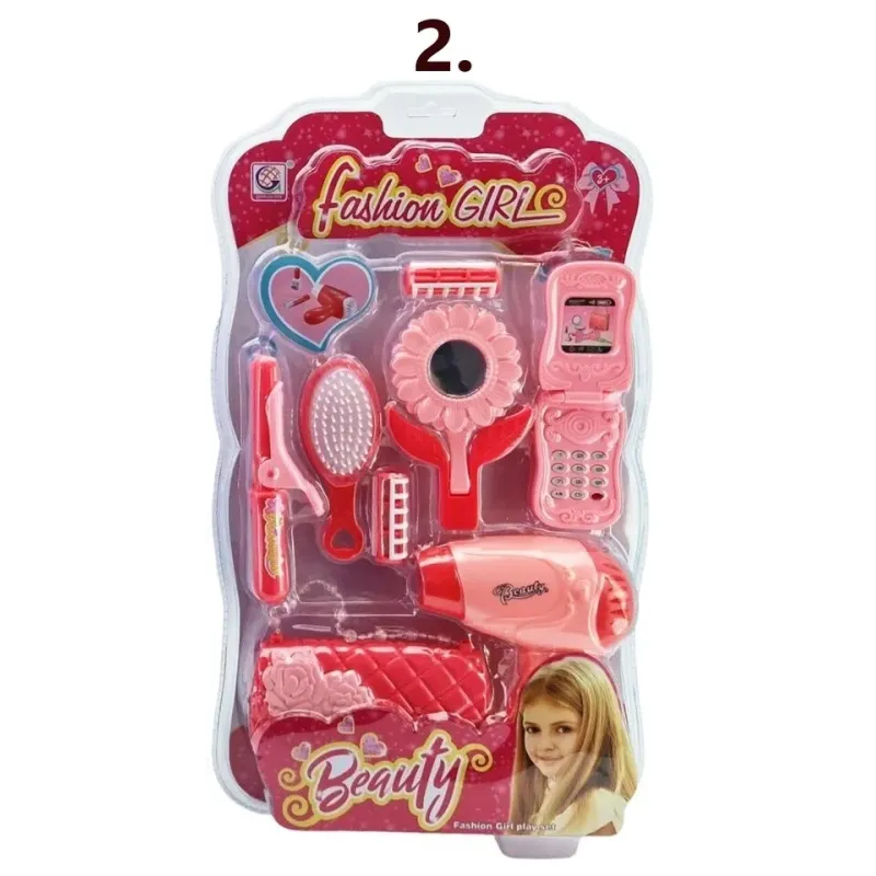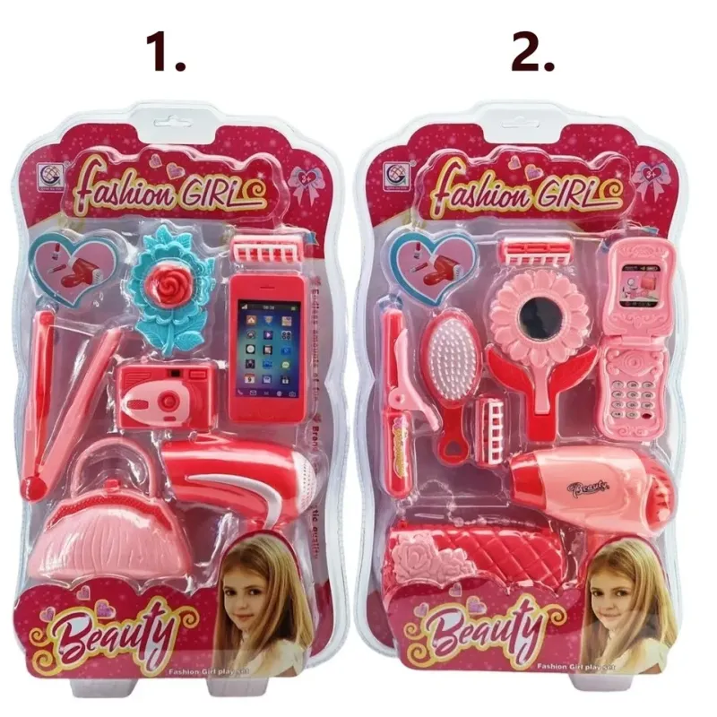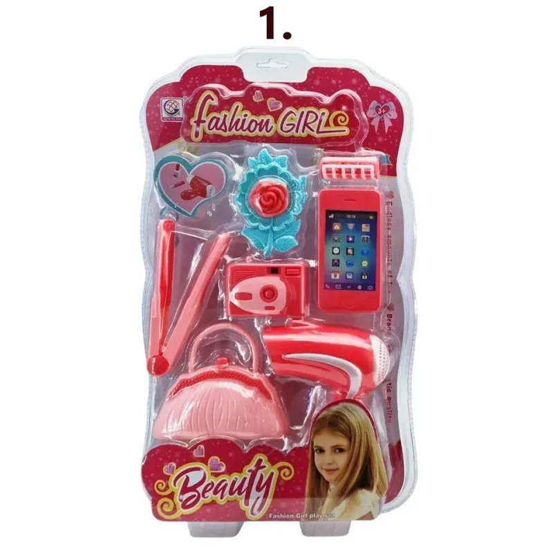 Kozmetický set 1. obsahuje: fén, kabelku, kulmu, telefón, natáčky do vlasov, foťák, brošňu