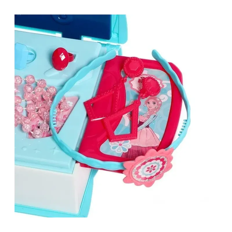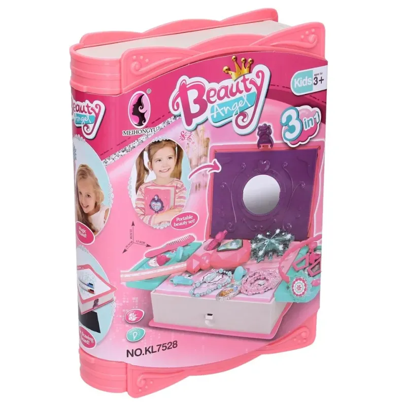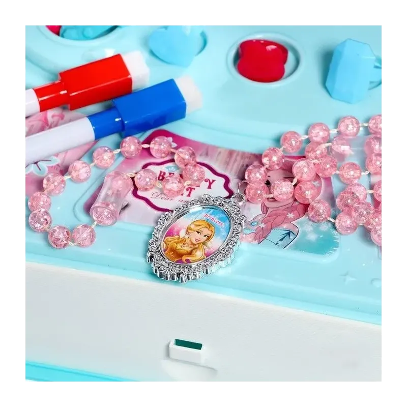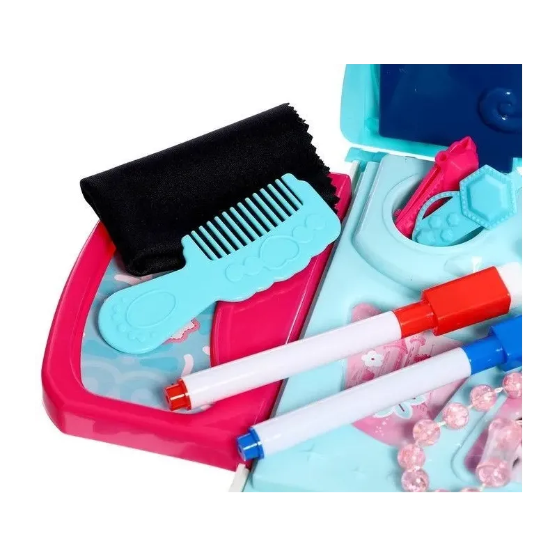 Obsahuje sponky, šperky, kúzelnú paličku, náhrdelník, hrebeň, čelenku, fixky na tabuli s handričkou na mazanie a s nalepovacou popisovateľnou fóliou.