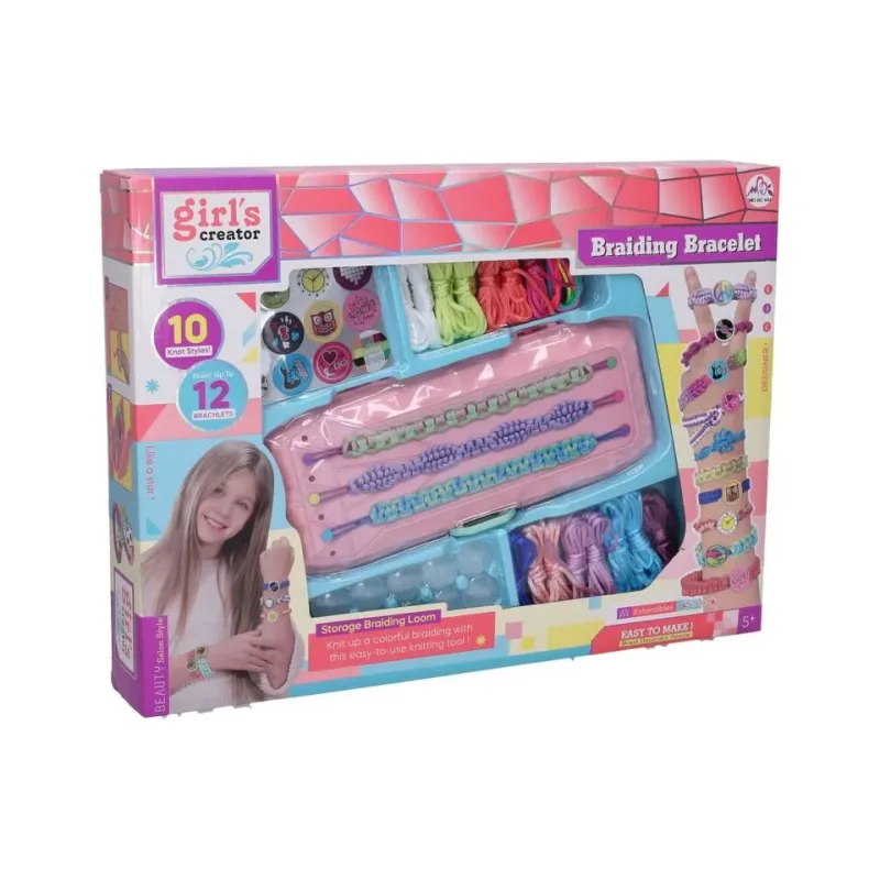 Krabička na zaháknutie náramku pri pletení a na uloženie potrieb na tvorbu náramku,Obsahujekrabičku na zaháknutie náramku pri pletení a na uloženie potrieb na tvorbu náramku,ozdoby,nálepky,návod,povrázky na tvorbu náramkov.Veľkosť krabičky 23cm.Zo sady je možné vyrobiť až 12 náramkov.Návod obsahuje 10 štýlov pletenia.Vek: 5+