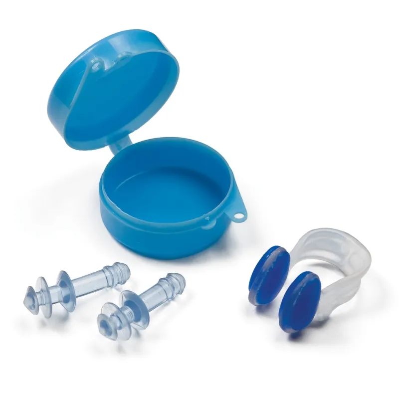 Štuple sú navrhnuté tak, aby sadli do každého ucha a ochránili ucho pred infekciou.Štipec zabraňuje vstupu vody do nosa. štuple z čistého silikónu, štipecpevné, priehľadné púzdro