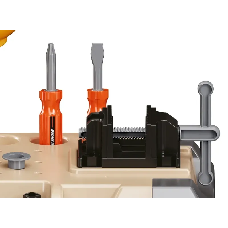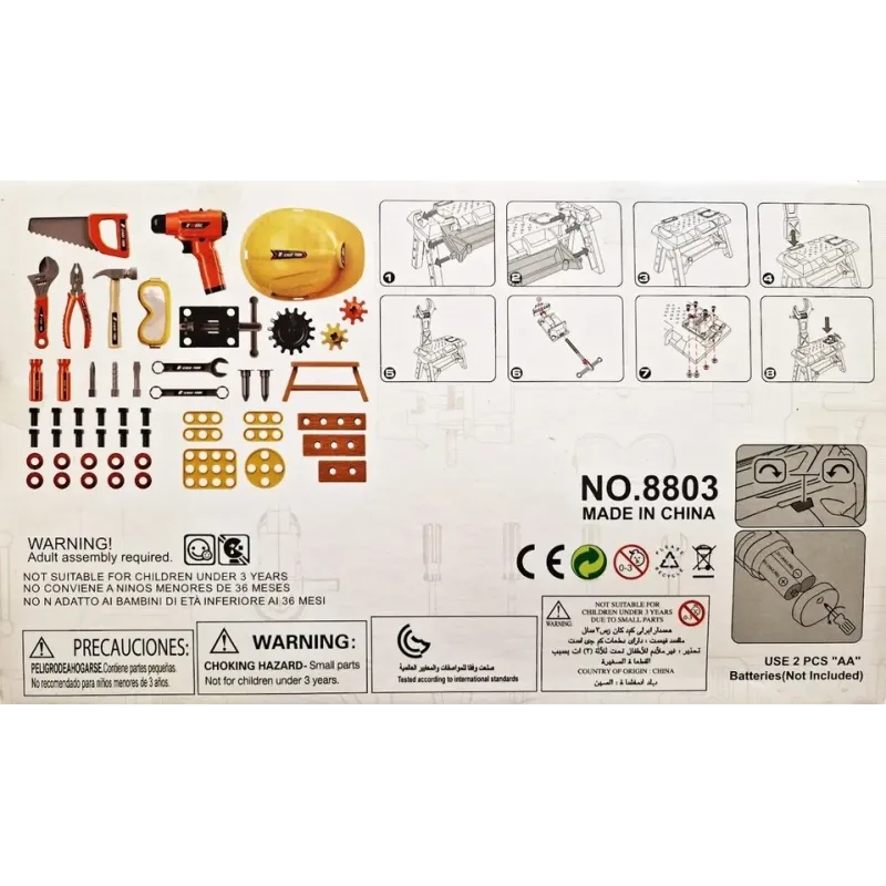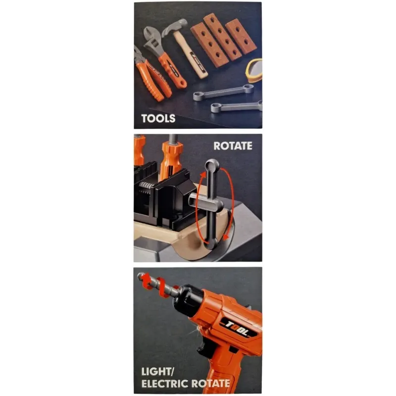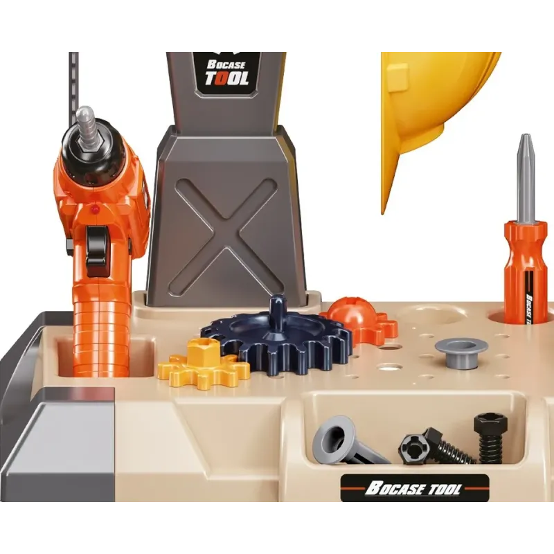 Obsahuje stolík, zverák, prilbu, elektrickú vŕtačku, pílu, 2 skrutkovače, kladivo, kľúč, kombinované kľúče, 2 kľúče, ochranné okuliare, stoličku, 3 ozubené kolieska, 8 skrutiek, 8 matíc, 2 hmoždinky, 3 drevá.