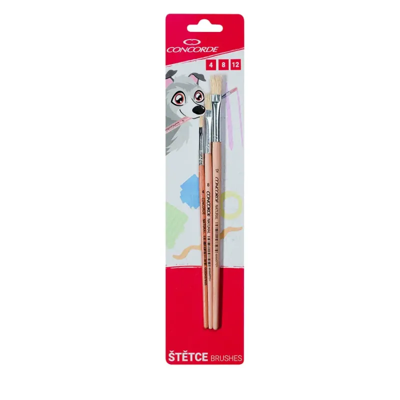Súprava troch plochých Natural štetcov č. 4, 8, 12. Drevená rukoväť.Použitý materiál: prasacie štetiny. Dodávané na blistri.