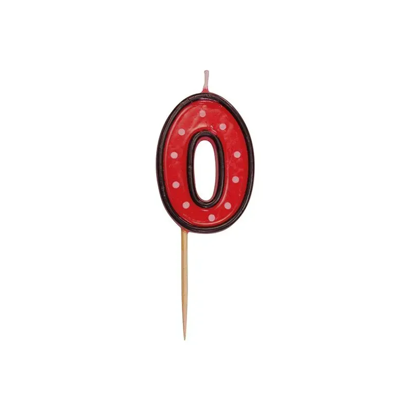 Narodeninová sviečka na tortu s číslom 0 na špajdli. Farba: červená s čiernym lemom. Dĺžka: 50 mm.