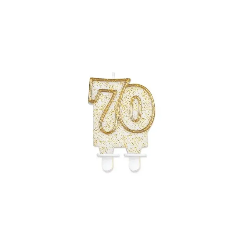 Narodeninová sviečka na tortu glitrovaná s číslom 70. Farba: bielo-zlatáVýška: 8cmŠírka 7cm