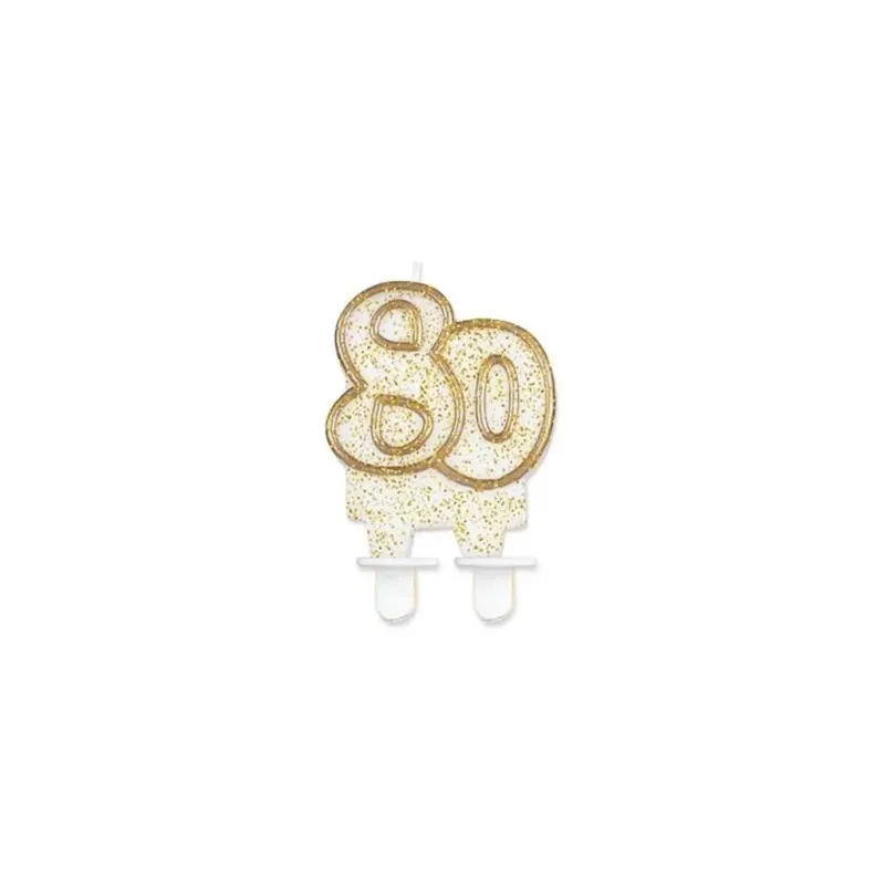 Narodeninová sviečka na tortu glitrovaná s číslom 80. Farba: bielo-zlatáVýška: 8cmŠírka 6,5cm