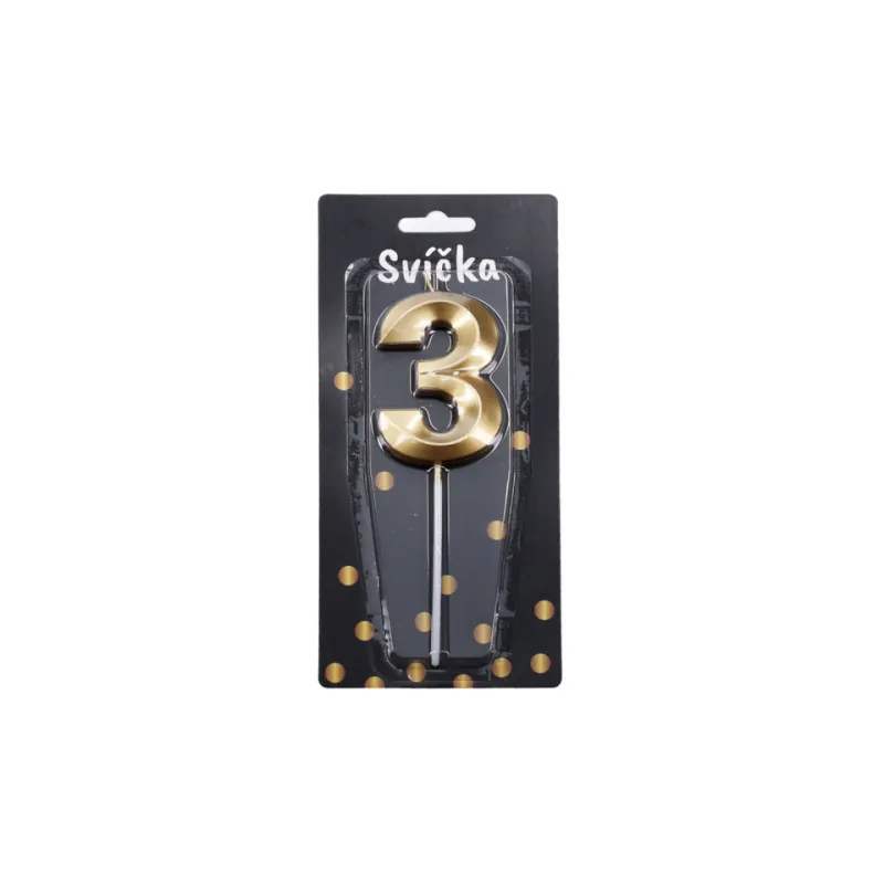 Narodeninová sviečka zlatej farby číslo ,, 3 ", bude dokonalou ozdobou slávnostnej torty.