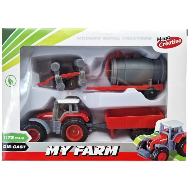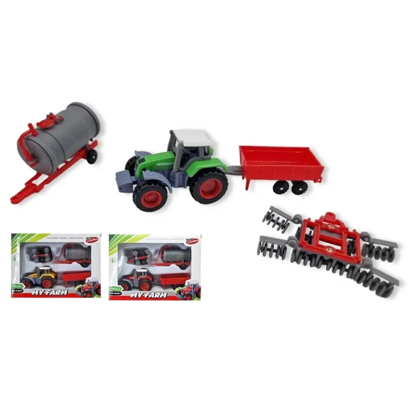 Malý moderný traktor s rôznymi variantami prívesov pre malých poľnohospodárov.