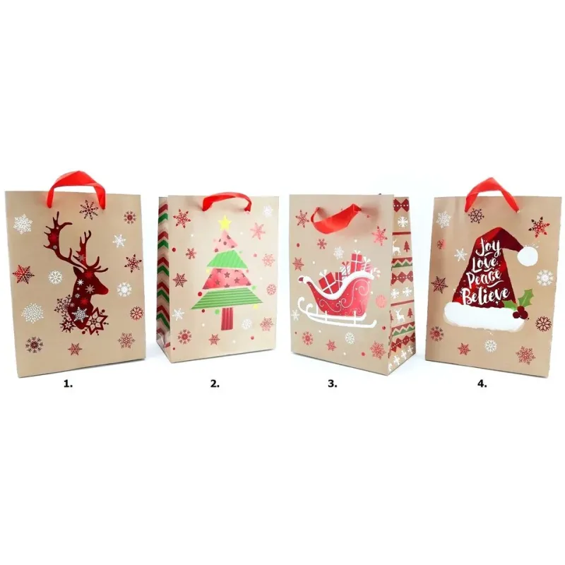 Darčeková taška vyrobená z kvalitného tvrdého papiera s vianočnými motívmi, vhodná na jednoduché balenie darčekov.