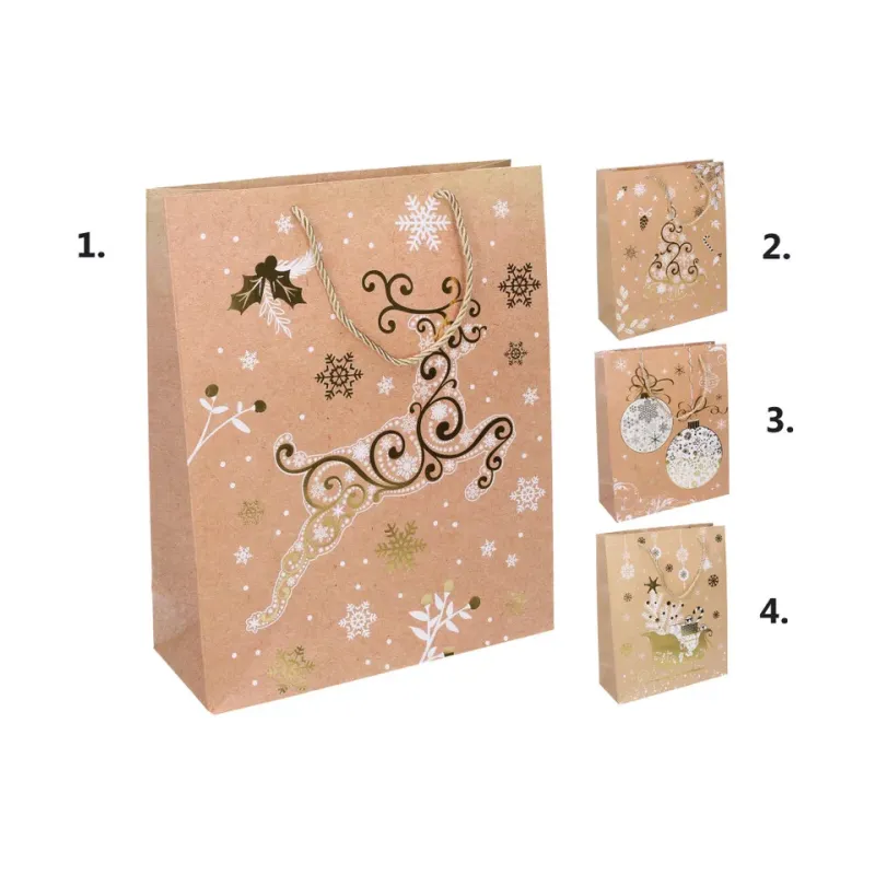 Vianočná darčeková taška Darčeková taška vyrobená z kvalitného tvrdého papiera s rôznymi motívmi, vhodná na jednoduché balenie suvenírov a darčekov.
