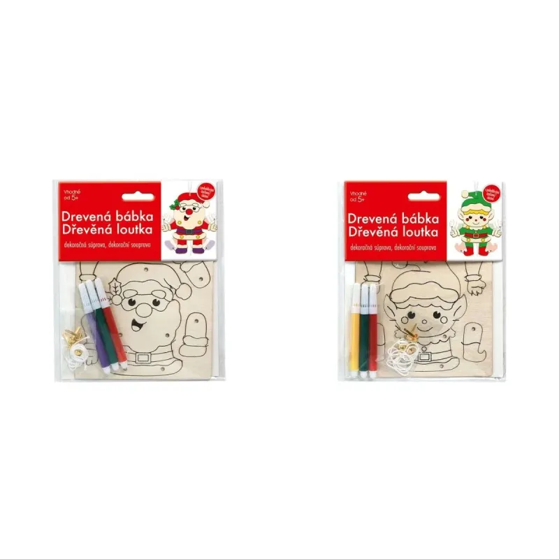 Diely drevenej bábky si dieťa vyfarbí podľa svojej fantázie a spojípomocou priložených nitov. Kreatívna sada obsahuje obrázok dreva Mikulášaalebo šaša, šnúrku, 3 ks farebných mini fixov a 4 spojovacie nity.
