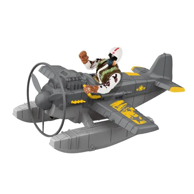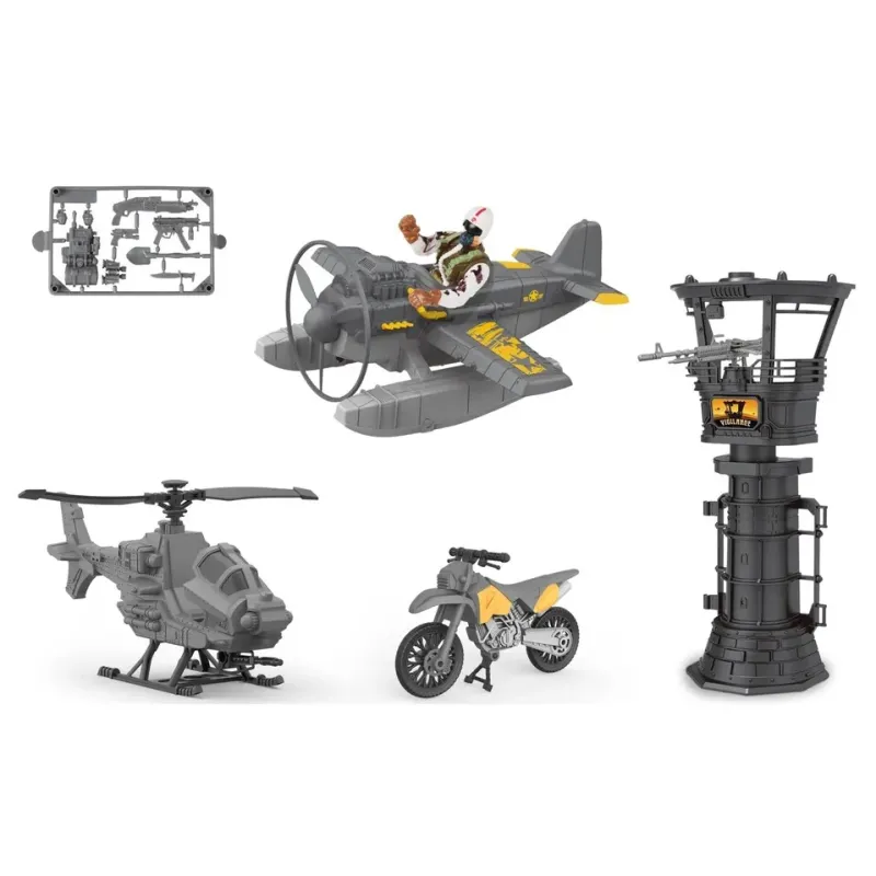 Obsahuje lietadlo, vežu, figúrku pilota, motorku, vrtuľník, zbrane a príslušenstvo pre pilota.