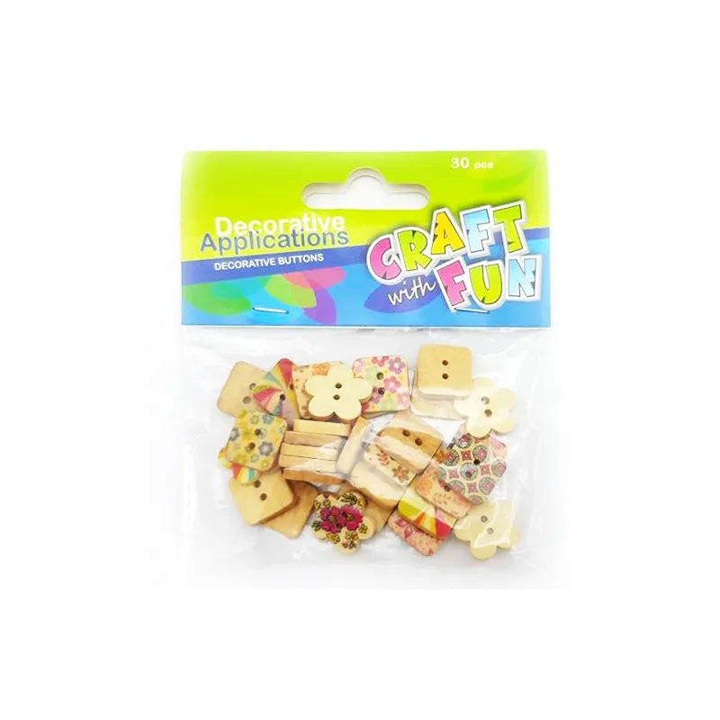 Drevené dekoračné gombíky v tvare kvetinky alebo štvorčeka. 2-dierkové, mix rôznych vzorov.