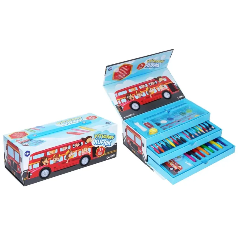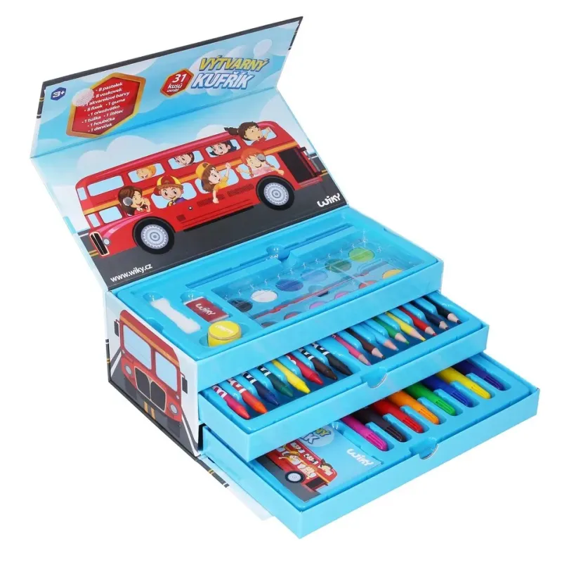 Sada obsahuje: 8 pasteliek, 8 voskoviek, 1 akvarelovej farby, 8 fixiek, 1 guma, 1 strúhadlo, 1 ceruzka, 1 štetec, 1 hubka, 1 denníček
