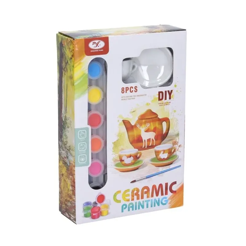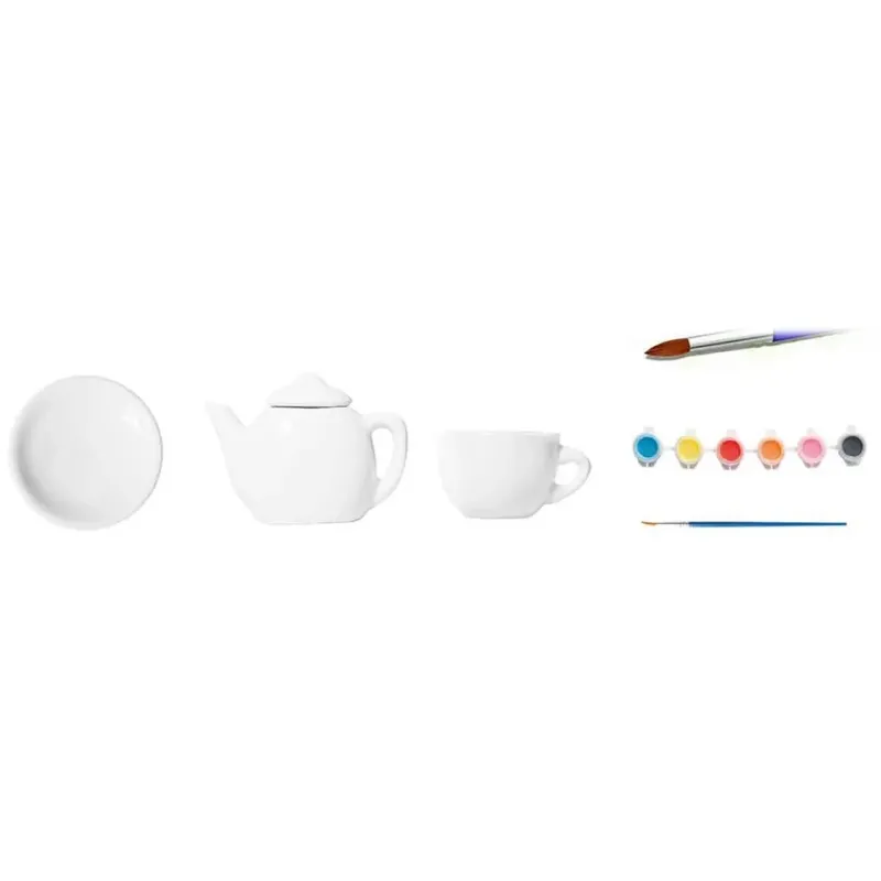 Kreatívna sada maľovaný riad.Kreatívna sada obsahuje čajník s pokrievkou, 2 šálky a 2 podšálky, sadu 6 farieb a štetec.Veľkosť čajníka je 7 x 5 cm, veľkosť šálky je 4,6 x 2,6 cm, tanierik má priemer 5,6 cm.