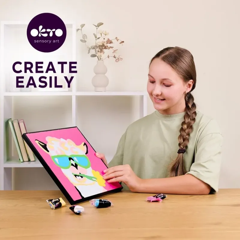 OKTO kreatívna modelovacia sadarozvíja jemnú motoriku a koncentráciumá mäkkú textúrupodložka 29 x 29 cms predkresleným motívomodporúčaný vek : 5+Obsah balenia - rám, plátno, obrázkový návod, modelovací nástroj, sada farebných tvarovacích zmesí 14 ks