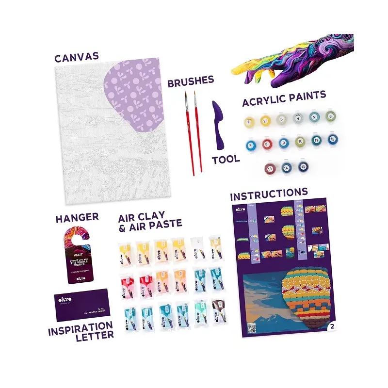 Sada obsahuje všetko potrebné na vytvorenie trojrozmerného obrazu - prírodné plátno, návod, drevený modelovací nástroj a air clay.