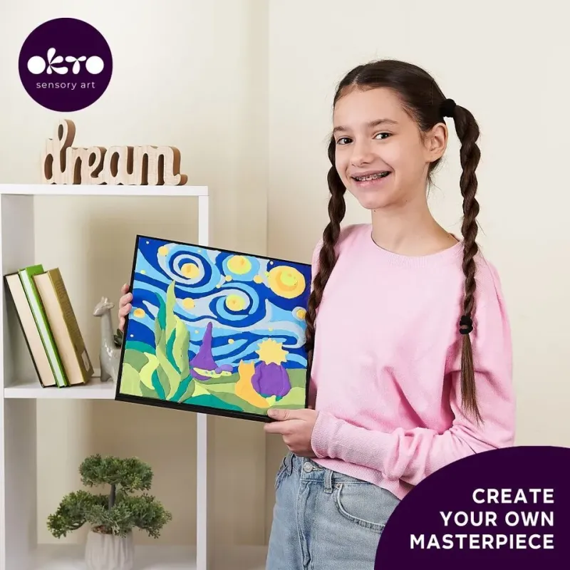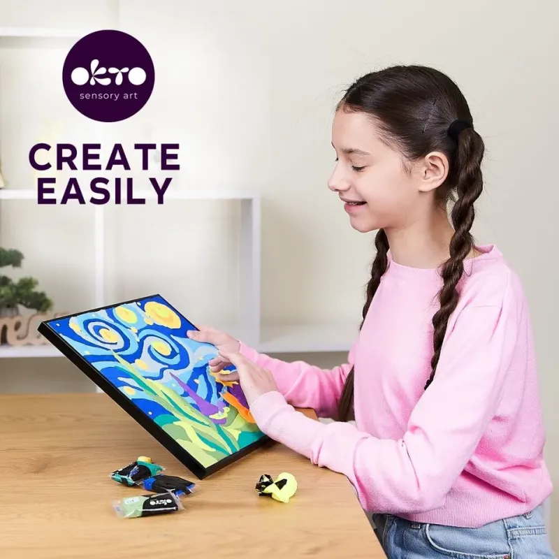 OKTO kreatívna modelovacia sadarozvíja jemnú motoriku a koncentráciumá mäkkú textúrupodložka 29 x 29 cms predkresleným motívomodporúčaný vek : 5+Obsah balenia - rám, plátno, obrázkový návod, modelovací nástroj, sada farebných tvarovacích zmesí 14 ks