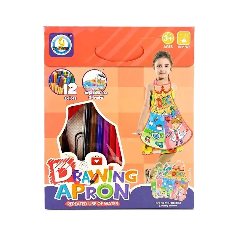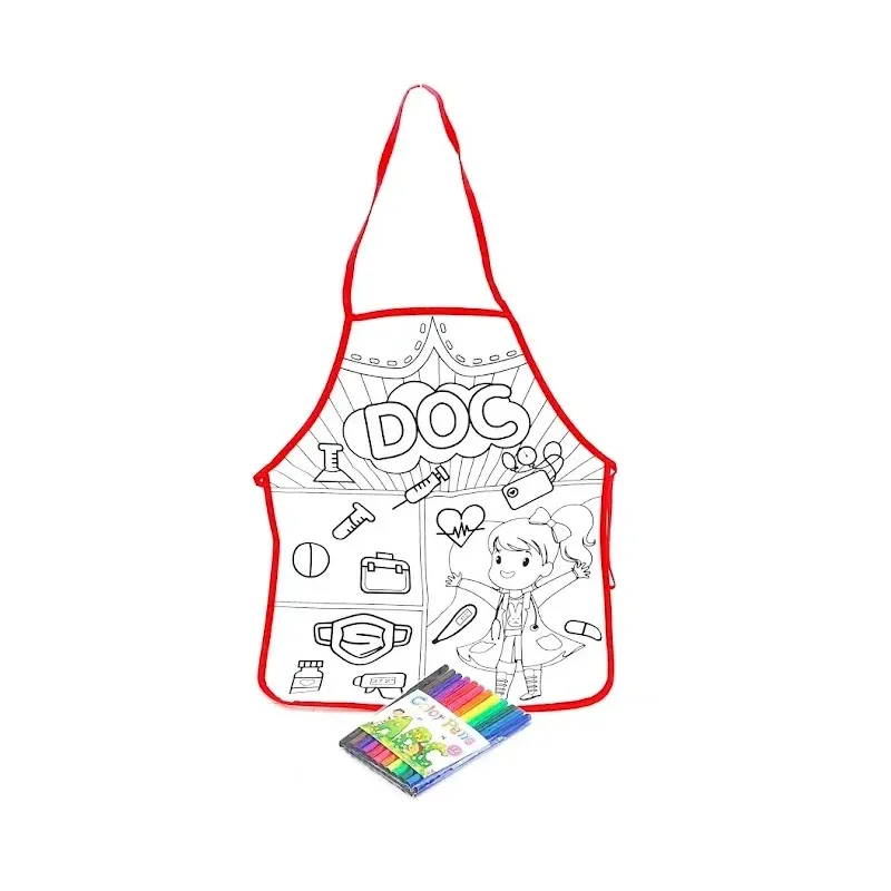 Kreatívna sada na vymaľovanie zástery obsahuje 12 farebných fixiek a zásterku s predtlačeným motívom.