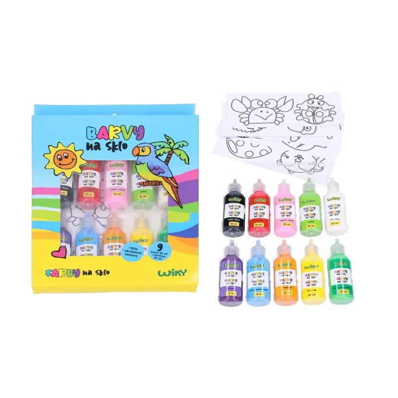 Obsahuje: 9 farieb (červená, ružová, zelená, biela, fialová, modrá, oranžová, žltá, tmavo zelená) 22 ml + kontúra čierna 22 ml + fólie + šablónové obrázky