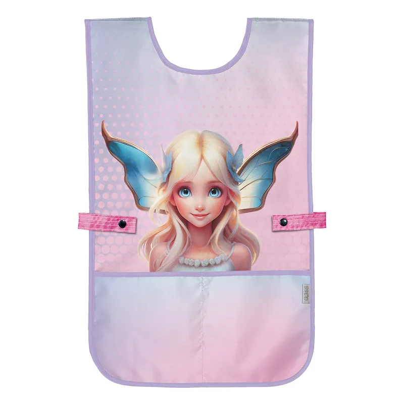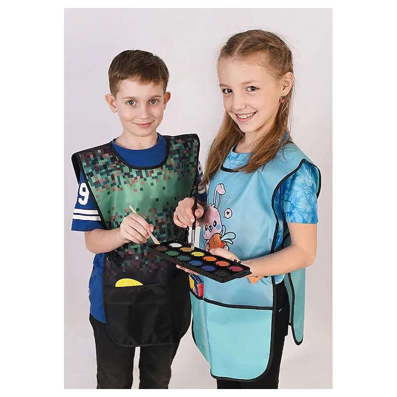Praktický strih zásterky na výtvarnú výchovu pončo, ktorá jezapínateľná na cvoky – dieťa nemusí zásterku zaväzovať na chrbte,cvokmi si jednoducho nastaví veľkosť okolo pásu a zároveň má vďakanovému strihu chránenú väčšiu časť tela.