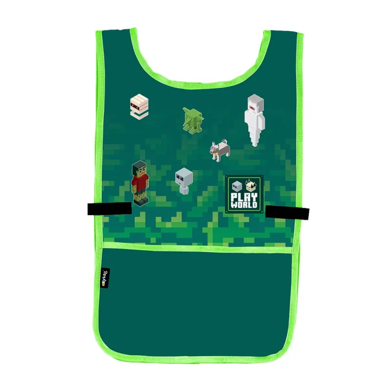 Zástera pončo do výtvarnej výchovy či na iné tvorivé aktivity. Obliekanie cez hlavu, po stranách zapínanie na druk. Vpredu jedno priestorné vreco.
