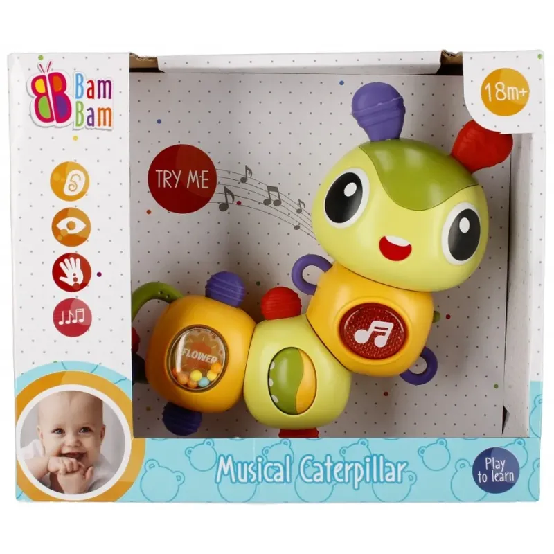 Tykadlá a nohy húsenice fungujú ako hryzátko, ktoré dieťaťu prináša úľavu v náročnom období prerezávania zúbkov.Húsenica má tri otočné časti tela, každá s iným príslušenstvom:1 - tlačidlo s melódiami a bľabotaním a smiechom bábätka,2 - malé guličky rotujúce vo vnútri,3 - s niekoľkými malými guľôčkami umiestnenými za priehľadným plastovým oknom.